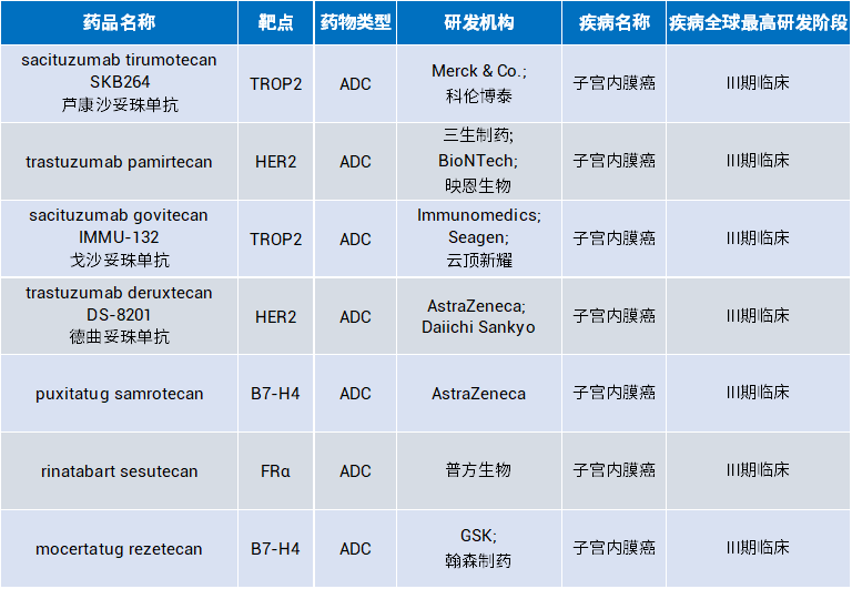 相比之下,子宫内膜癌领域仍处于临床拓展阶段。多款针对HER2、Trop-2等靶点的ADC管线正在推进,重点聚焦于复发或难治人群。随着分子分型不断细化及特异性靶点的识别,ADC有望在特定亚型中建立差异化治疗优势。